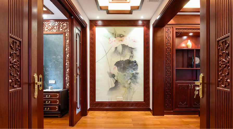 中式屏風做成的護墻與中式刺繡搭配餐廳門框處采用的中式花格隔斷地下一樓客廳書房處用書法所做的背景墻書房全景二樓房間房間內一角地下一樓客廳